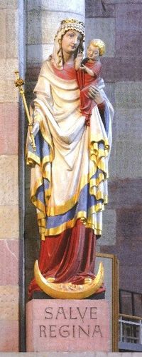 Jede Kirche hat den Namen einer Heiligen oder eines Heiligen. Wie heißt Eure Kirche? Dieser Dom ist nach Maria benannt: Er ist ein Marien-Dom. Deshalb hat Maria mit Jesus auf dem Arm hier einen guten Platz.